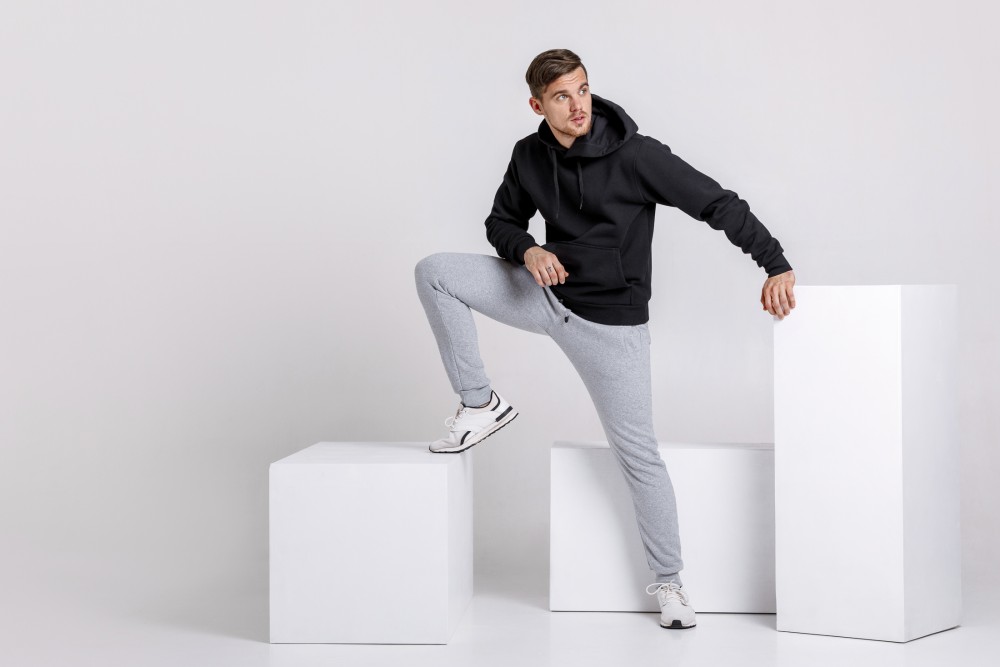 Мужской спортивный костюм — черная худи и серые штаны на флисе, осень-зима