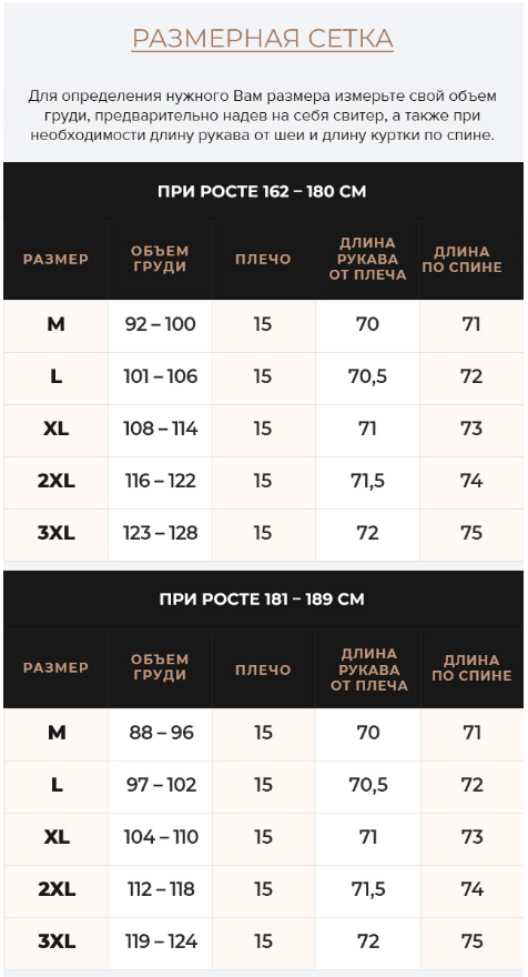 - Размер подбирайте по таблице, учитывая теплый свитер или теплую одежду в которой вы обычно ходите зимой.